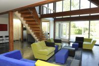 Het pand is volledig in houtbouw uitgevoerd, waarbij de gelamineerde Lariks spanten het meest in het oog springen.